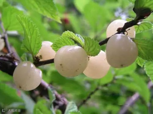 ▼白色的樱桃你见过吗?果肉硬而脆,味甘甜,较耐贮藏与运输。