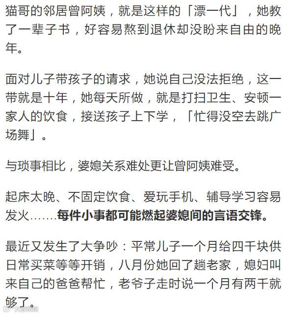 六个钱包买房的后遗症不小,对于很多父母来说基本掏光积蓄,如果没有好的养老金,老后生活是个问题,与儿女同住是个选择,但是这让不少本来稳定的家庭横生波折。