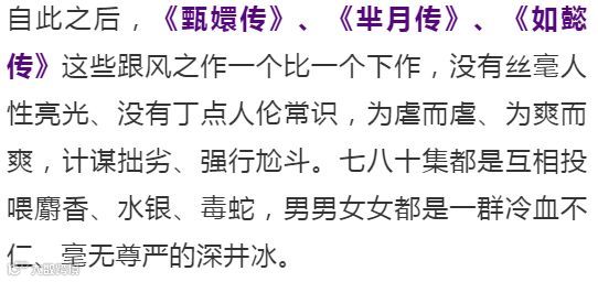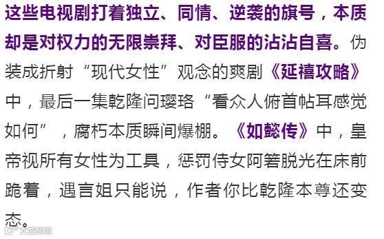 遇言姐说,不管桥段清奇还是暗黑、不管人物爽利还是隐忍、不管服装多么精致华美、不管拍摄多么细致入微,我都看不下去这两部后宫剧,因为它们的核心是对男权和臣服的明贬实褒、心向往之。