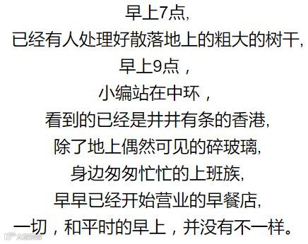 9月17日早上5点20分,八号风球摘下,意味着这座城市要重新开始运转,各行各业需要回归岗位。许多人质疑特首为什么不让香港放假一天,然而,事实是这样的。