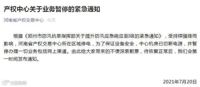 河南省产权交易中心表示,根据《郑州市防汛抗旱指挥部关于提升防汛应急响应至I级的紧急通知》,受持续强降雨影响,河南省产权交易中心所在区域停电,为了保证设备安全,中心机房已切断电源,并暂停办理一切业务包括网上渠道。由此给大家带来的不便深表歉意,待恢复正常后,会第一时间发布通知。