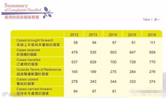香港保险投诉局于2016年共处理了770宗投诉个案,全年投诉案件比内地一季度投诉案件零头都少。其中,有374宗已经审结,余下的须留待2017年处理。