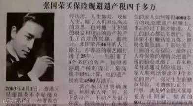 張國榮生前積累了3億港元資產,但按照香港的稅法,張國榮的遺產受益人應為此財產上繳4千多萬元的遺產稅。好在張國榮生前考慮周全,先後累計購買了數張人壽保險,據張國榮生前的保險代理人說,張國榮保險意識很強,並高度認同保險理財規劃的重要性。身故前的張國榮除最後一筆保險金無效外,生前的壽險保額可以充分抵繳遺產稅。
