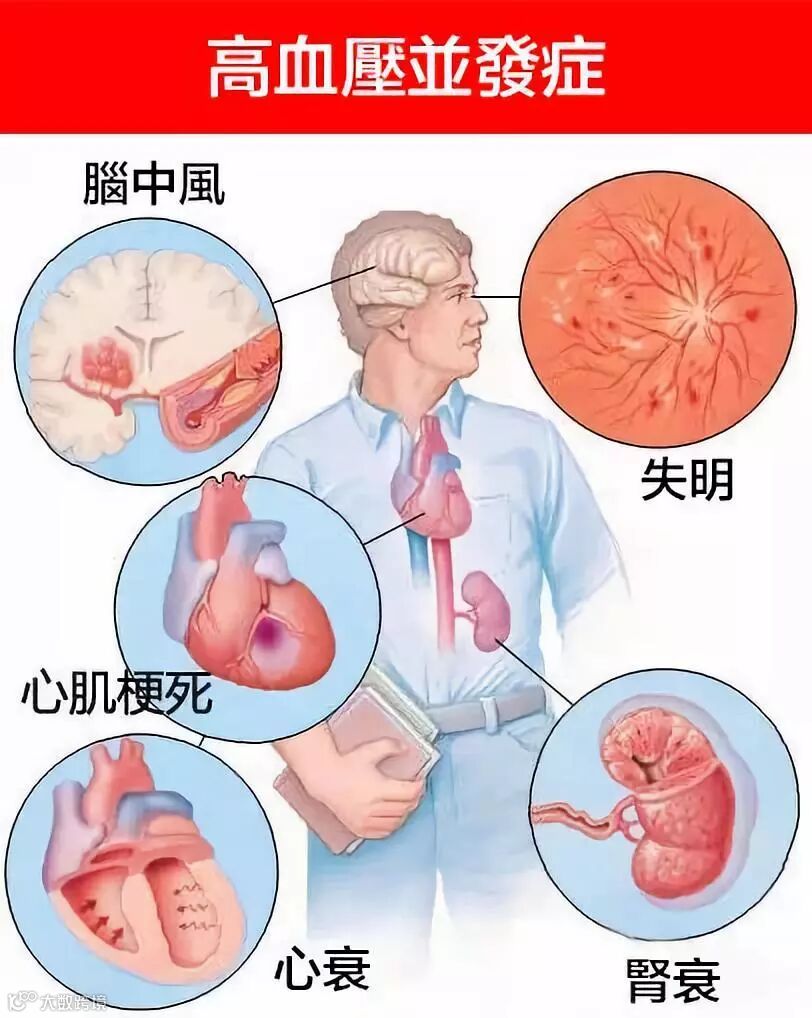 高血壓的危害:腦血管爆裂、心絞痛、腦血栓、高尿酸、腎臟受損、勃起障礙等。