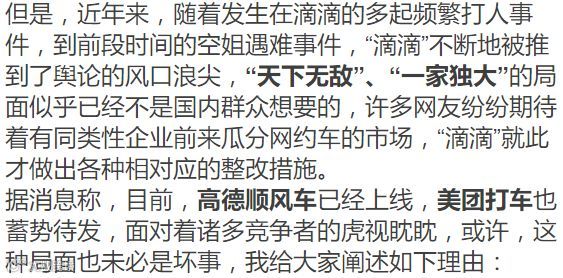 说起“天下无敌”的企业,滴滴打车应该算是网约车界的大哥大了,从2012年开始,一轮轮融资、补贴大战,与快的合并,收购优步中国。滴滴这家企业一出生就仿佛与身俱来了一套无敌拳,打得让人眼花缭乱,举目而望,中国市场上竟然没有了能与之抗衡的同类企业。