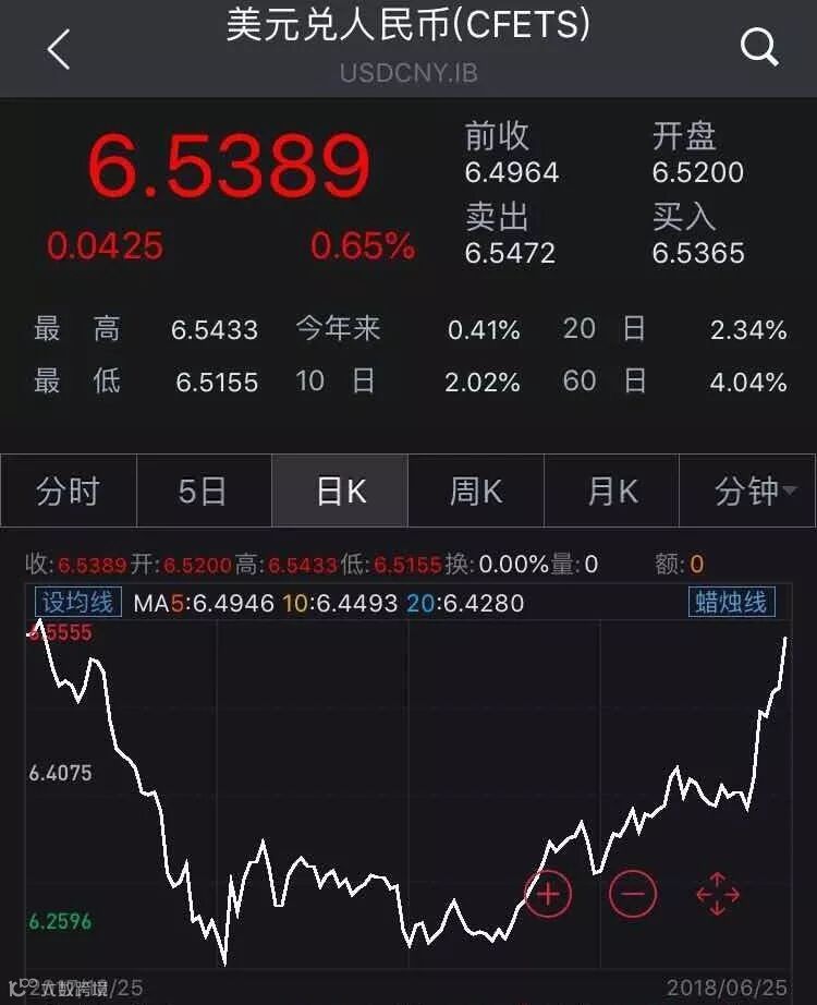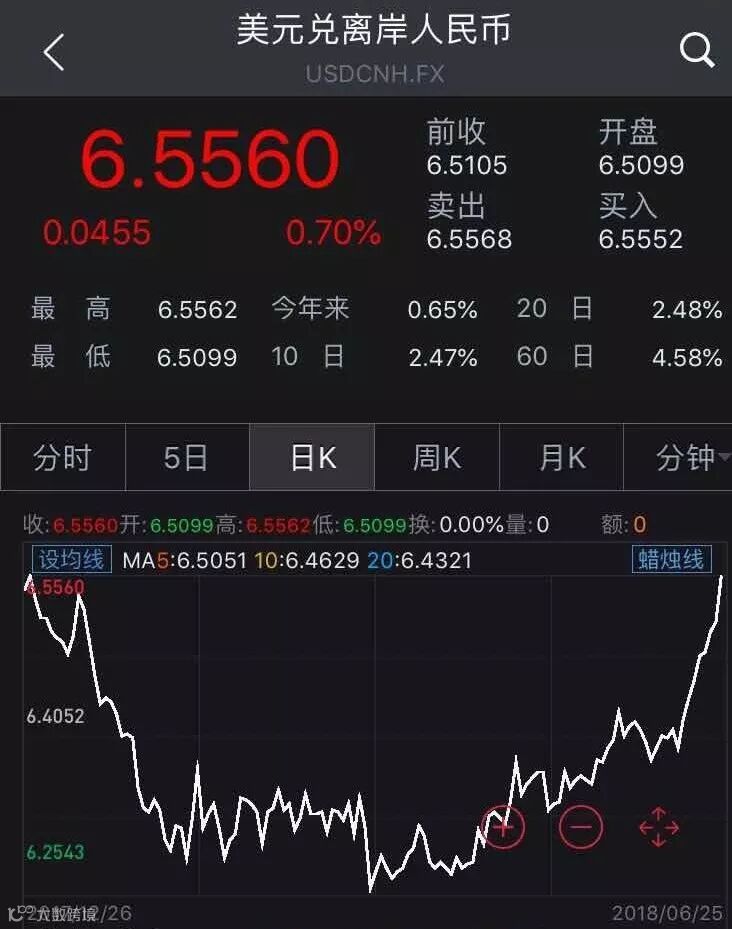 4月2日,离岸人民币已经从当天开盘价6.2627,一路贬值到6月25日的最高价6.5536,在不足3个月时间里,人民币已经贬值了超2900个基点。