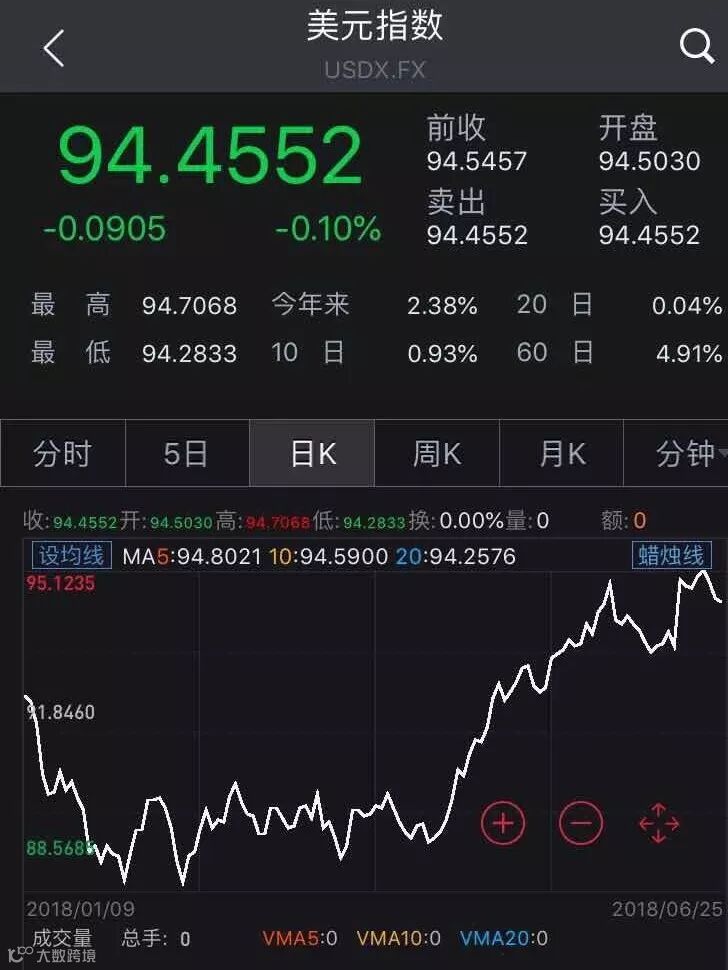 今年以来美元指数累计升值了约2.5%。2018年4月2日以来美元对人民币中间价累计贬值超过2000点,美元指数一度在6月20日升值到95.1234,为2017年7月以来最高值。