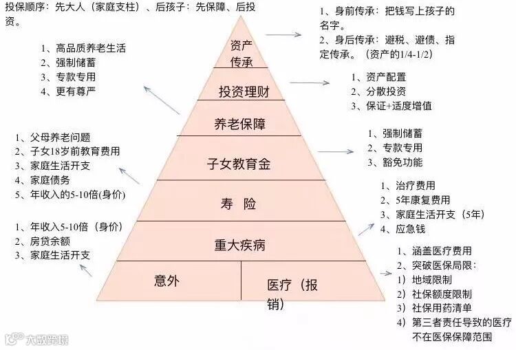 家庭如何配置保险来帮助规避未知风险,如下金字塔模式,自下而上为配置的先后顺序。