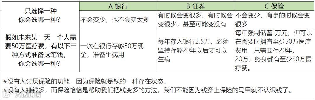 第三是把买保险当花钱,不知道是没事当存钱(存钱,就会觉得越多越好),有事变大钱。