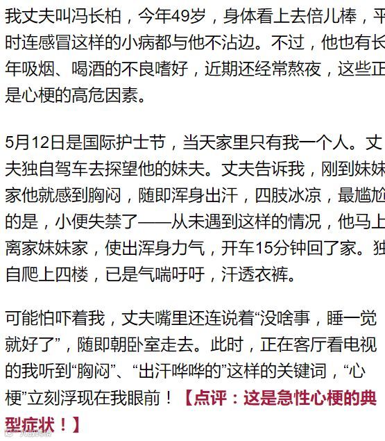 可以说,我对心梗的发病症状、治疗过程熟记于心。可从没想过自己的丈夫会突发心梗,更没有想到凭借自己掌握的心梗急救知识救了丈夫一命。