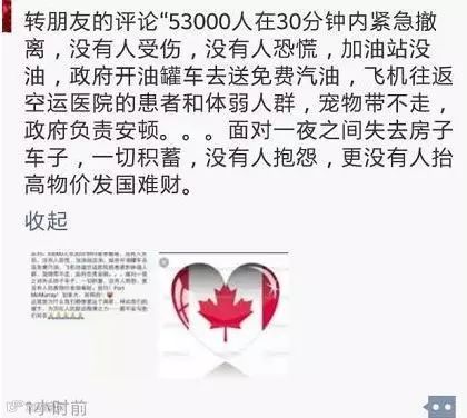 有网友评论说,看一个国家好不好,不仅要看在太平盛世有多和谐,也要看在灾难来临时政府和人民如何应对。53000人在30分钟内紧急撤离,没有人受伤,没有人恐慌,加油站没油,政府开油罐车去送免费汽油,飞机往返空运医院的患者和体弱人群,宠物带不走,政府负责安顿……面对一夜之间失去房子车子,一切积蓄,没有人抱怨,更没有人抬高物价发国难财……