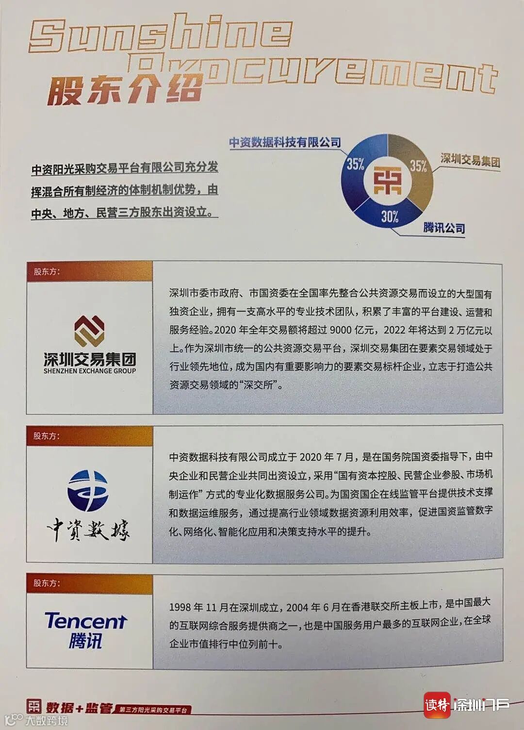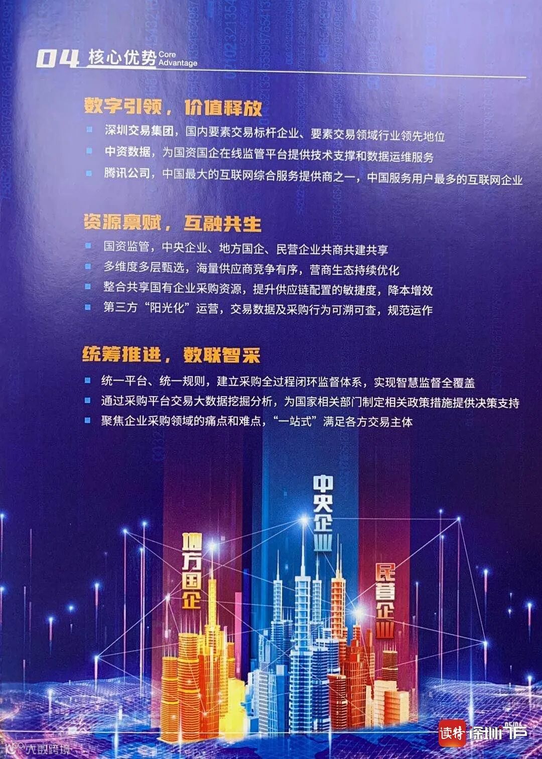 中资阳光采购交易平台包括基础采购交易、供应链管理、大数据咨询以及金融服务等板块,由深圳交易集团有限公司、中资数据科技有限公司及腾讯公司联合成立的混合所有制合资公司运营,致力于打造国内规模最大、技术领先、服务一流的互联网采购平台,提升央企采购专业化水平和效率,降低采购成本,构建更加完善的央企采购监管体系,助推企业采购交易集约化、规范化、信息化水平提升,推动央企实现高质量发展。