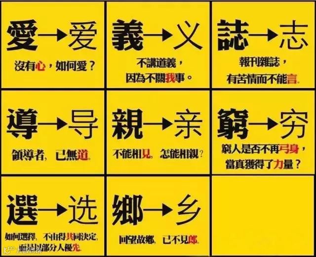 一位学者说:汉字简化后,親不见,愛无心,產不生,厰空空,麵无麦,運无车,導无道,兒无首,飛单翼,有雲无雨,開関无门,鄉里无郎。