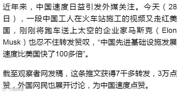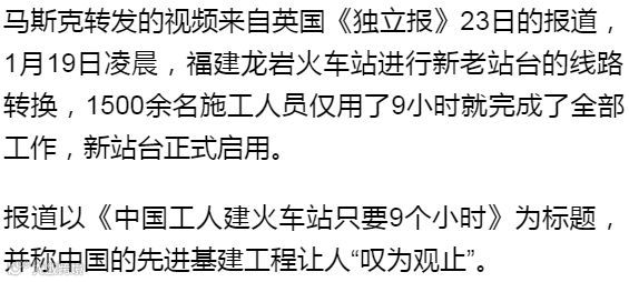 马斯克转发的龙岩站施工视频,曾在中国视频网站和社交媒体热传。人民日报海外社交媒体团队为这段视频配发英文字幕,并于1月22日通过人民日报优兔、脸谱、推特官方账号发布,迄今视频播放总时长超过300小时,观看量150多万,引发外国网民对“中国速度”的惊叹和赞扬。