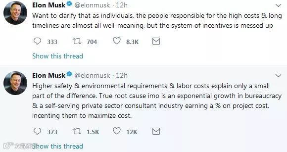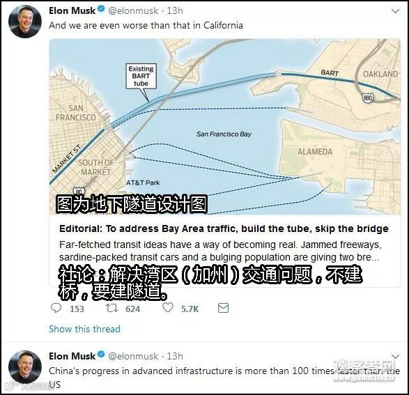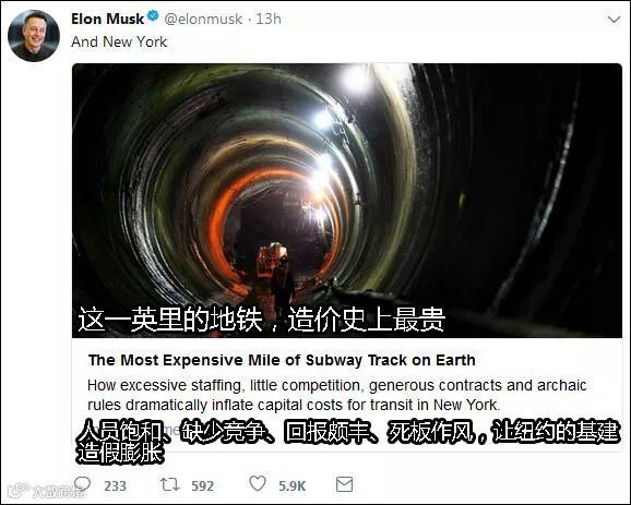 马斯克还对美国的基建行业现状做出了自己的看法。他表示,安全、环保、人力只是一小部分因素,官僚体系和以利益最大化为目标的私企们,才是造成美国基建落后的“罪魁祸首”。