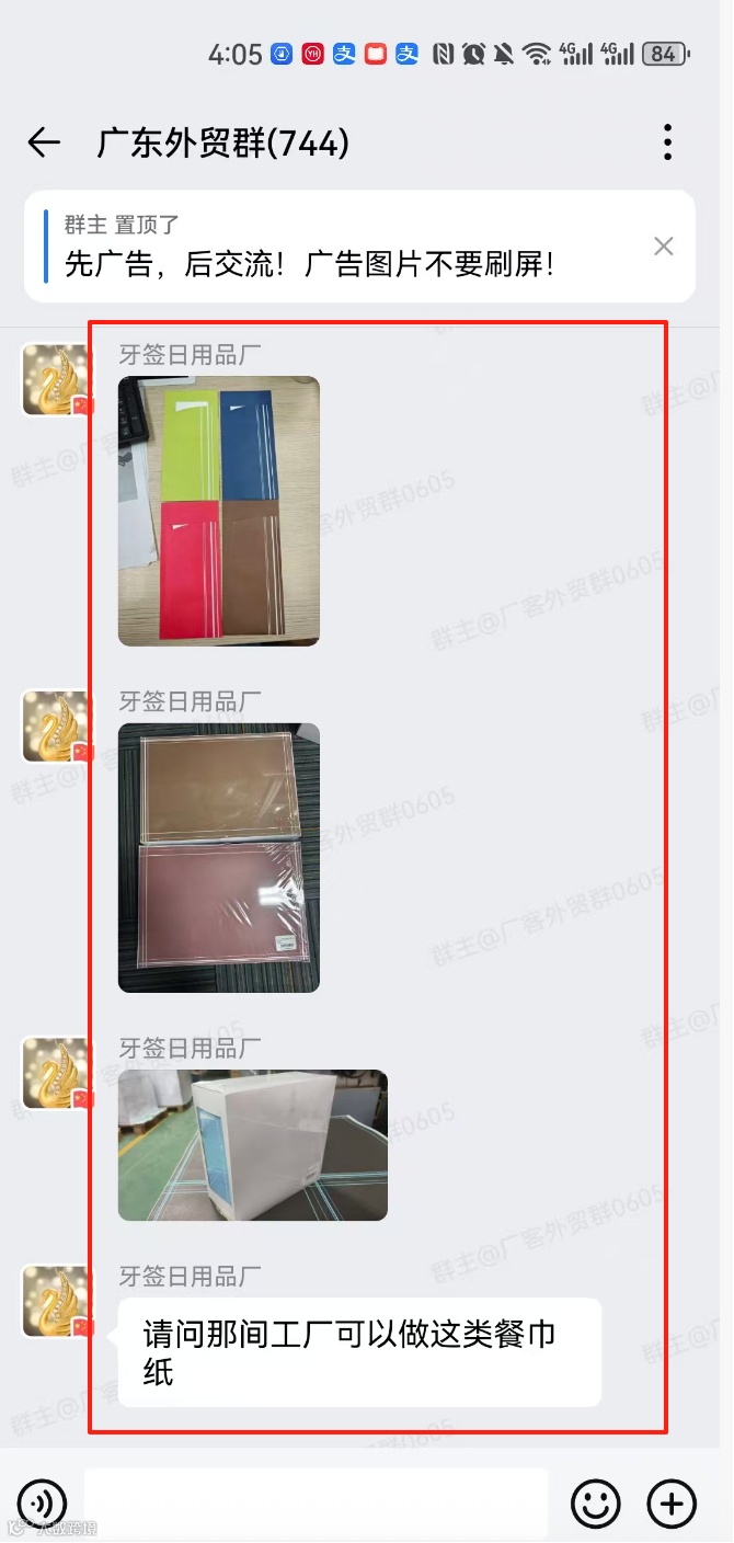 群里可以发布的信息:外贸采购信息、产品销售信息,文字、图片、视频都可以,控制广告频率,不能刷屏广告。