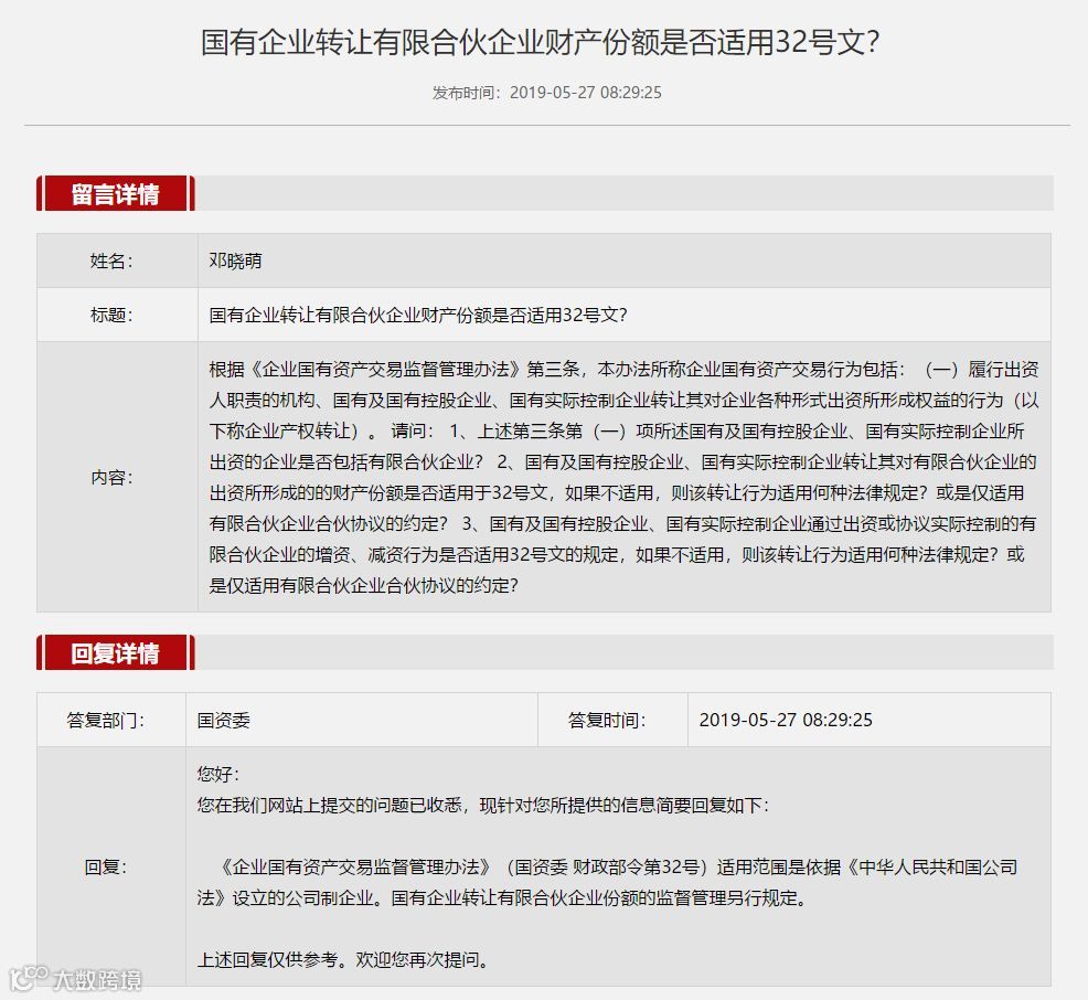 另一次是2019年5月27日对公众留言问题“国有企业转让有限合伙企业财产份额是否适用32号文”所作的回复:32号令适用范围是依据《中华人民共和国公司法》设立的公司制企业,国有企业转让有限合伙企业份额的监督管理另行规定。据此可以明确,有限合伙企业不属于32号令规定的企业范畴。