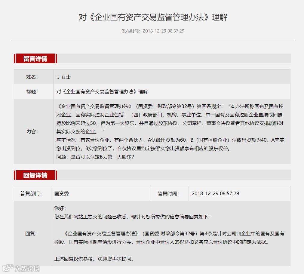 一次是2018年12月29日对公众留言问题“根据32号令第4条国有及国有控股企业、国有实际控制企业的分类界定,如何认定合伙企业第一大股东”所做的回复:32号令第4条是针对公司制企业中的国有及国有控股、国有实际控制等情形进行分类,合伙企业中合伙人的权益和义务应以合伙协议中的约定为依据。