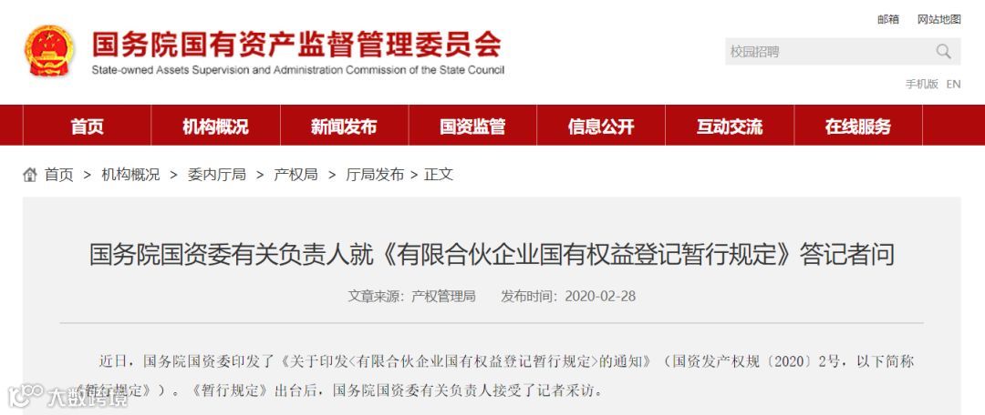 2020年2月7日,国务院国资委印发《有限合伙企业国有权益登记暂行规定》(以下简称《暂行规定》),明确要求各中央企业和各地方国资委,要对有限合伙企业国有权益进行登记管理。