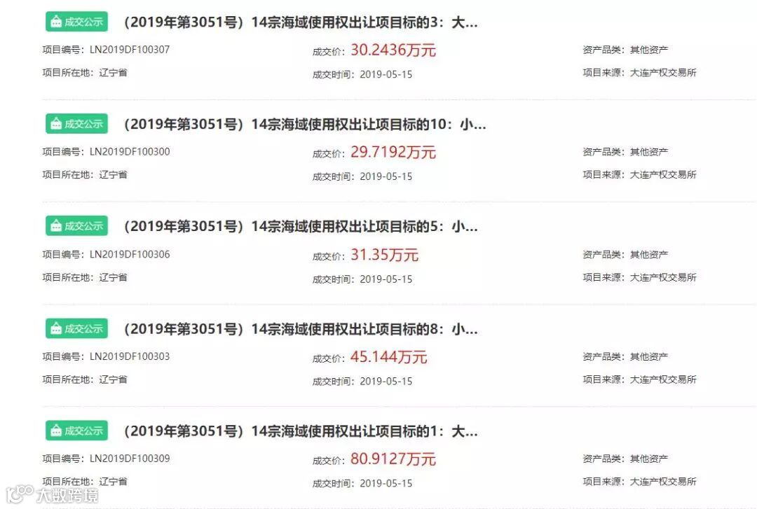 除了山东,在全国产权行业信息化综合服务平台上搜索也发现,5月份以来,辽宁地区多处海域通过网络竞价方式转让,成交价格在30万-80万元不等。