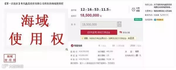目前,正在进行网络拍卖的烟台海阳市大闫家镇新生村海域使用权,起拍价:118,024,359元,保证金:118,024,359元,增价幅度:730,000元(以及其整倍数)。