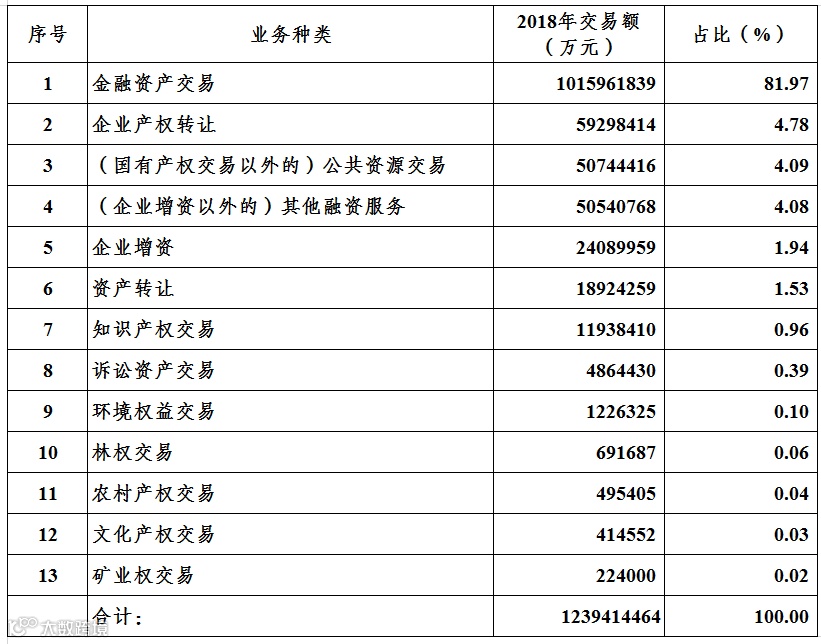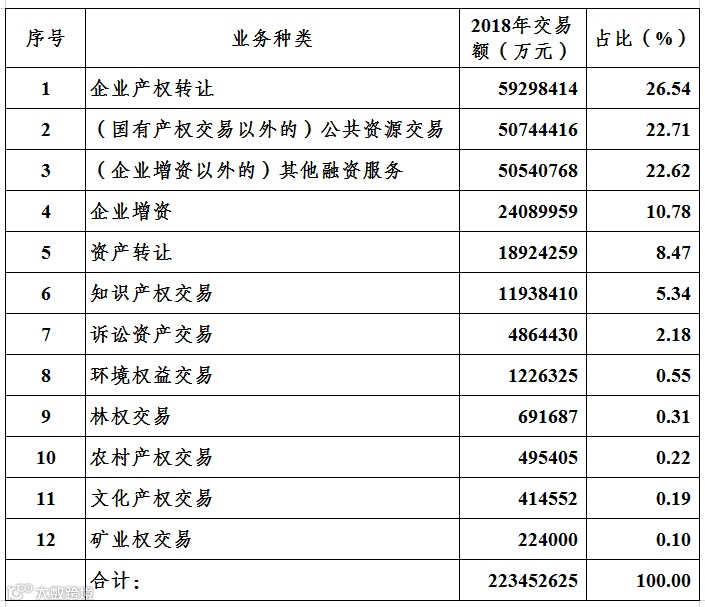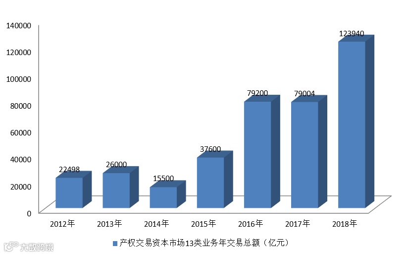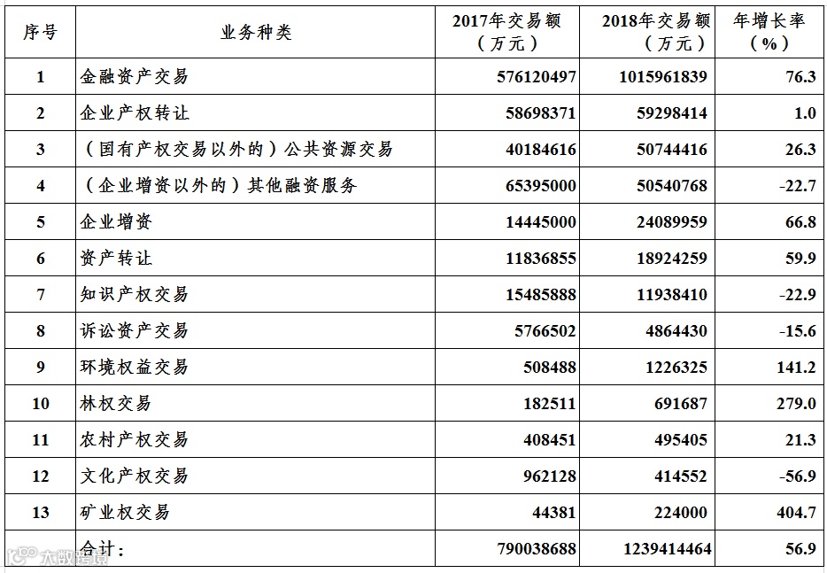 2018年产权交易行业13类业务共成交项目205万宗,相比2017年(164万宗)增长25%;年交易额首次突破10万亿元,达到12.39万亿元,相比2017年(7.90万亿元)增长56.9%。