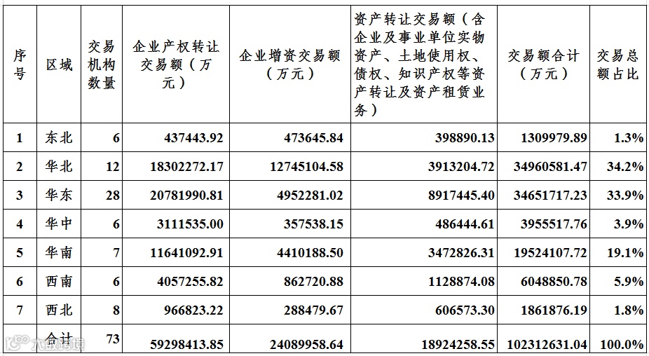 企业产权转让、企业增资和资产转让三类业务按地理区域划分交易额分布情况