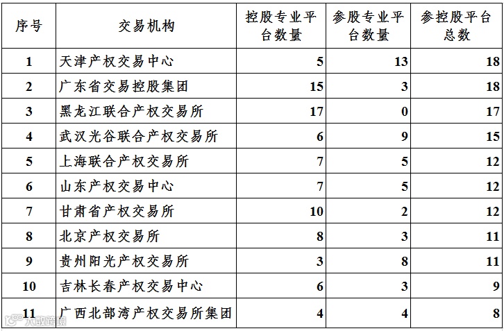 2018年,38家产权交易机构控股或参股具有独立法人地位的专业平台224家(其中控股122家),参控股的专业平台数量比2017年(195家)增长15 %。参控股8家以上专业平台的产权交易机构11家。控股的专业平台主要集中在以下业务领域:产权交易服务(35个),知识产权交易(13个),环境权益交易(10个),股权登记托管(7个),农村产权交易(6个), 金融资产交易(6个),拍卖(4个),矿业权交易(4个),财务顾问服务(3个),资产管理(3个),林业产权交易(3个),金融科技服务(3个),电子商务(2个),文化产权交易(2个)。