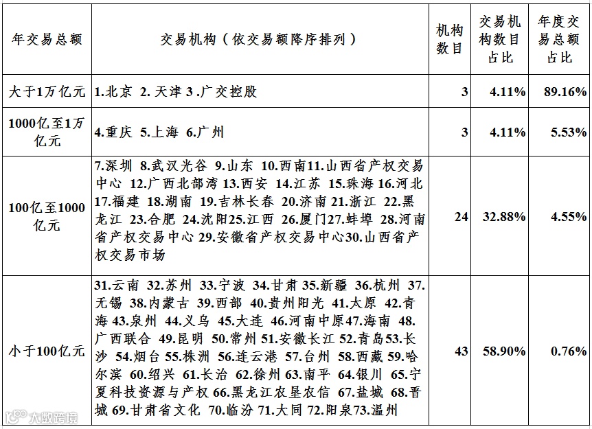 73家交易机构中,注册资本在5亿元以上的有3家,1亿元(含)至5亿元之间的有16家,5000万(含)至1亿元之间的有9家。