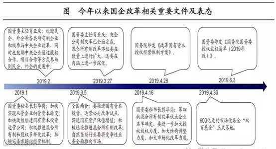 政策层面上,相关文件以及试点工作频频落地。年初以来国资委领导就多次表态,指出要加快实现从管企业向管资本的转变,以及积极推进混合所有制改革,全国两会中进一步明确要“推进国有资本投资、运营公司改革试点,促进国有资产保值增值,积极稳妥推进混合所有制改革”;4月国务院印发《改革国有资本授权经营体制方案》;6月国资委印发《国务院国资委授权放权清单(2019版)》,进一步向管资本推进,加大对国有企业的授权力度。