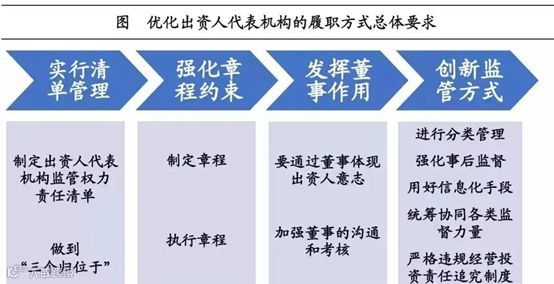 一是对于授权主体而言,要求出资人代表机构优化履职方式,包括实行清单管理、强化章程约束、发挥董事作用和创新监管方式,而国资委的《授权放权清单》正是对该项所涉及的清单管理的具体化;