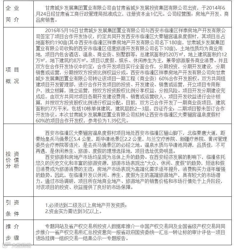 甘肃城乡发展集团置业有限公司对西安市临潼区大秦骊宫温泉度假村60%的项目合作开发权转让项目