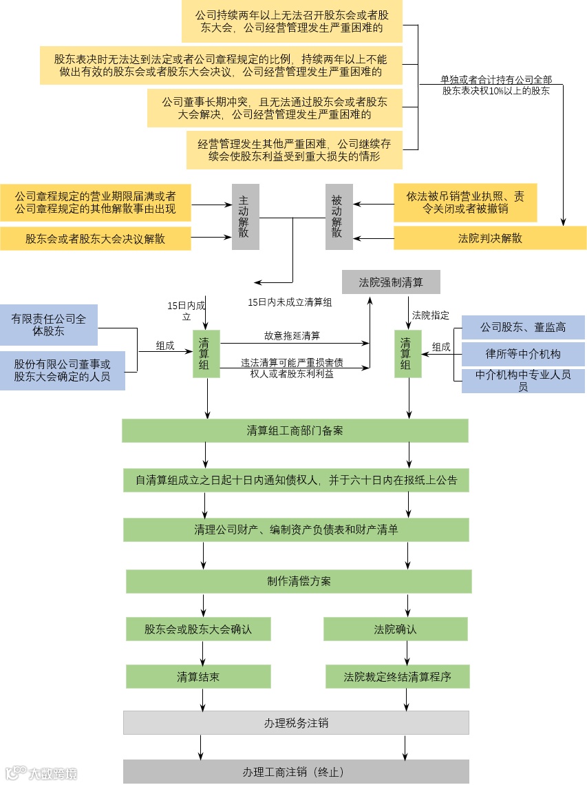 根据解散事由的不同又可将解散分为主动解散和被动解散,主动解散包括公司章程规定的营业期限届满、公司章程规定的解散事由出现以及公司的股东会或者股东大会决议解散等情形,被动解散包括公司被吊销法人营业执照、责令关闭、被撤销以及持有公司10%以上表决权的股东因特定事宜申请人民法院判决公司解散等情形。无论是主动解散还是被动解散,均是公司开展清算的前提条件。