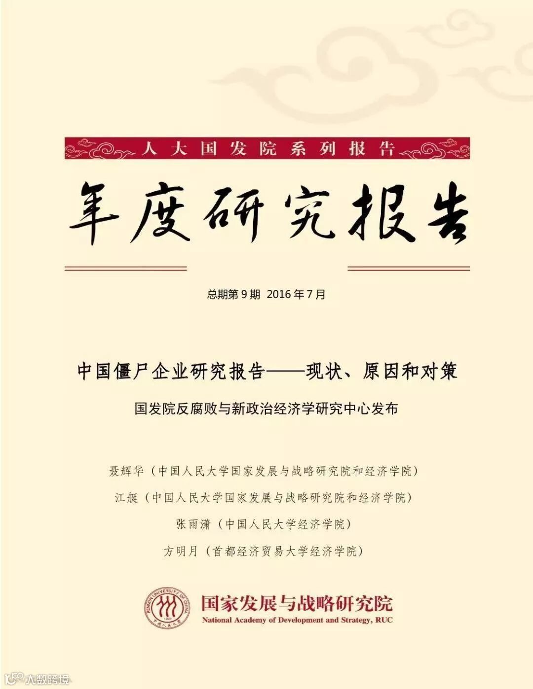 供给侧改革的关键,就是加快淘汰僵尸企业。在此背景下,中国人民大学国家发展与战略研究院僵尸企业课题组根据1998-2013年中国工业企业数据库和1998-2015年上市公司数据库,对中国僵尸企业进行了全面研究,并发布《中国僵尸企业研究报告——现状、原因和对策》。