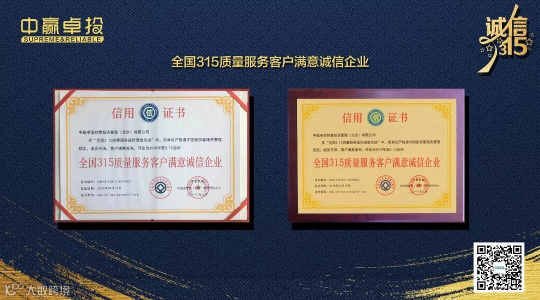 中赢卓投为了做更好的企业,2017年底就已积极配合相关评选组织在国内《企业质量信用评级标准及实施办法》等相关文件指导下,按国际信用评级惯例,对企业的基础信用、产品(服务)质量水平、质量保证能力、顾客满意度、社会诚信度等指标进行综合评估,最终凭过硬实力取得了“全国315质量服务客户满意诚信企业”认证。中赢为何如此?只为不断激励自身做更好的金融服务企业!做客户满意的良心企业!