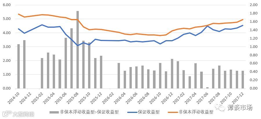 而从上图中看,15年9月债灾前夜,保本理财与非保本理财之间的利差(灰色柱状,右轴)极大,显示当时市场的资金是多么充沛,人们是多么乐观,随后利差便一路下滑,如今稳定在40bp左右,而以2015年9月作为分割点,15年9月前保本与非保本理财的平均利差超过110bp,之后至今仅有52bp且在不断减小中。