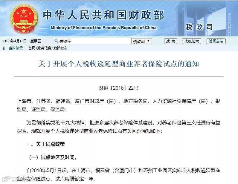 “犹抱琵琶半遮面”的税延型养老保险终于落地了。近日,财政部、税务总局、人社部、银保监会、证监会五部门联合发布通知,自2018年5月1日起,在上海市、福建省(含厦门市)和苏州工业园区实施个人税收递延型商业养老保险试点。试点期限暂定一年。