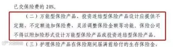 万能险、投连险只能作为一个独立险种销售,不能附加了。对于附加万能险账户的保险产品,这将是一个非常大的打击,目前市面上中小险企的主打产品当中,就有不少是以“一个主险+万能型附加险”形式存在的。
