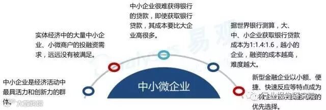 我国中小微企业约占中国企业总数的90%以上,中小微企业对中国经济贡献巨大,是经济活动中最具活力和创新力的群体,对实体经济具有积极的促进作用。但中小微企业在传统金融机构获得支持度较低。根据工商总局公布数据截至今年9月底,全国实有个体工商户5285万户,私营企业1802万户。截至2015年6月末,全国金融机构贷款(本外币口径)余额94.43万亿元,其中,小微企业贷款余额达22.05万亿元,占比23.35%。
