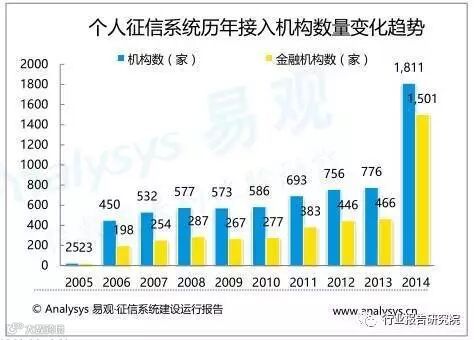 经过十年努力,征信系统接入机构数量逐年增加,目前企业和个人征信系统基本覆盖全国信贷市场,截至2014年底,企业和个人征信系统接入机构数分别为1724家和1811家。企业和个人征信系统为小微型金融机构,包括村镇银行、小额贷款公司、融资性担保公司、贷款公司、汽车金融公司、消费金融公司等提供系统接入和查询服务,目前分别接入小微型金融机构1179家和1236家,有利于普惠金融过程中的风险管理。