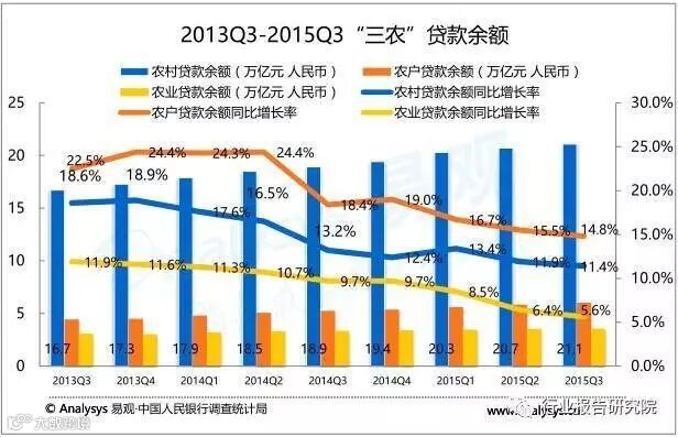 中国涉农金融机构(农村信用社、农村商业银行、乡镇银行等)累计机构数3566家,其中以村镇为例,全国有1 045个县(市)核准设立,县域覆盖率为54.57%,虽有增长但仍有空白;从三农贷款的增长情况看,从2014年末的19.4万亿,至2015年Q3增长至21.1万亿,贷款余额增速在逐渐放缓,为更好的支持三农,需要农村金融产品和服务方式创新来不断适应现代农业发展要求。