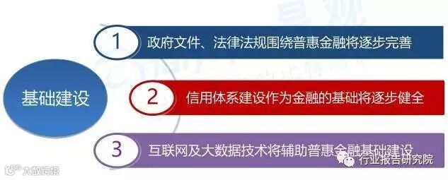 易观分析认为,随着国家对普惠金融的提倡以及对互联网金融的重视,针对互联网金融的法律支付和监管政策将逐步完善,普惠金融监测指标体系有望从局部到整体得到建立。其次,信用是金融交易的核心要素,互联网及大数据技术也是科技金融的重要技术手段,这些都将作为普惠金融的基础逐步健全。