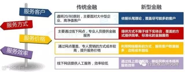 通过比较发现,现阶段传统的金融服务模式无法满足普惠金融的需求。通过互联网、大数据等技术为用户提供新型金融服务,能够把金融的支付清算、融通资金、股权细化、资源转移、风险管理和信息提供等功能在不同程度上都得到提升,是对传统金融质的升级。