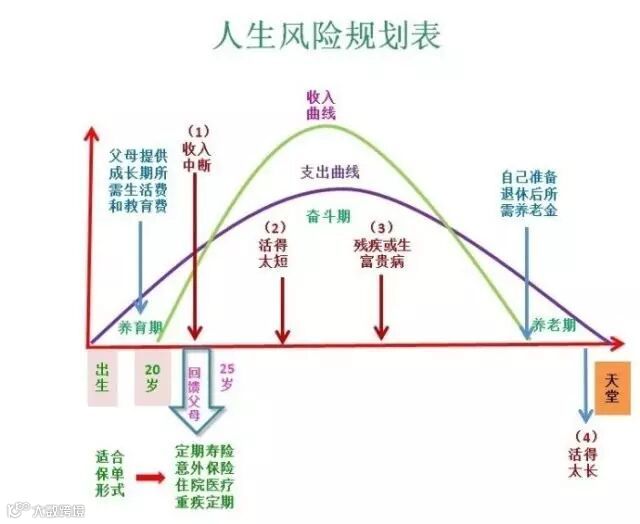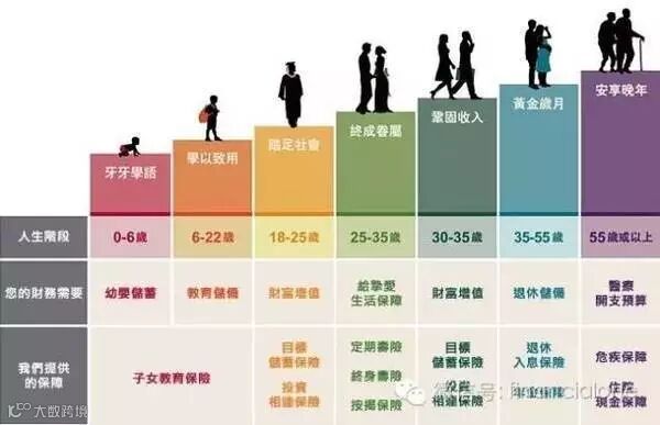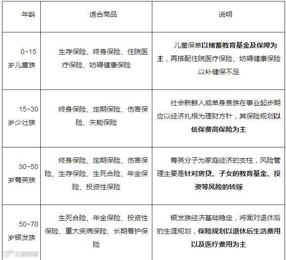 不同年龄层有不同的风险规划需求,下表为人生不同阶段建议应具备之保障内容,消费者可依自己实际状况,选择最合适的保险商品: