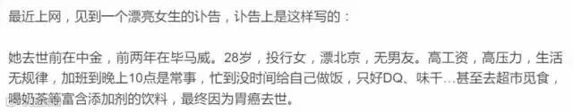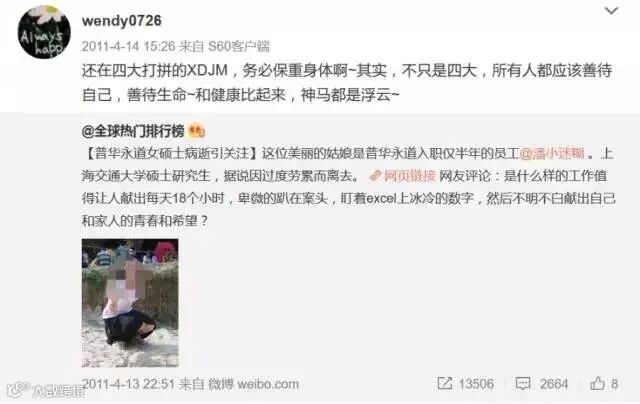 那位28岁北漂的投行姑娘,生前也曾转发感叹普华永道女硕士过劳离去的新闻,感悟和健康比起来,神马都是浮云。