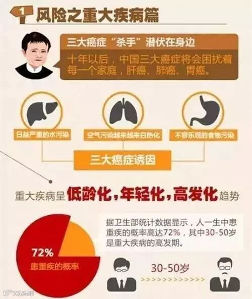 卫生部一项数据表明,人一生罹患重疾的几率高达72.18%,超过1/5的人会得癌症、10个健康男性中3个会在65岁前得重疾、10个健康女性中2个会在65岁前得重疾。