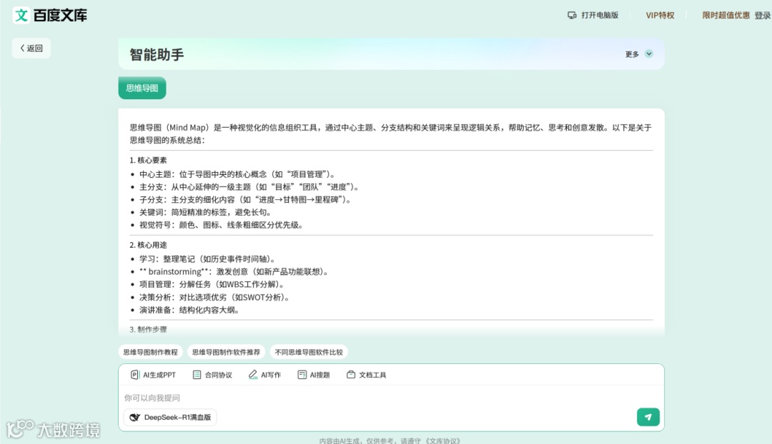而现在,在百度文库 AI 里,你只需要说一句话,比如“帮我做个关于短视频运营策略的脑图”,它几秒钟就能给你生成一个结构完整的初稿。你要做的,只是在它的基础上调整和深化。