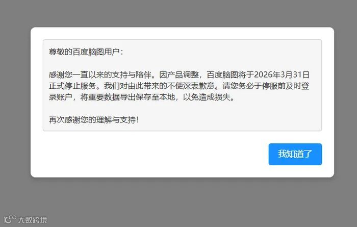 最近,百度脑图悄无声息地发布了一则公告,宣布这个在线思维导图工具,将于 2026 年 3 月 31 日 正式停止服务。