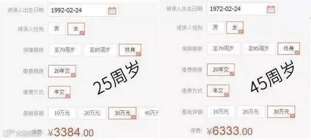 45周岁人群购买:保额30万,保障终身,20年交。那么20年的总保费:20×6333=126660元。从数值上可以看出,25周岁的人群比45周岁的人群多保障了20年,20年的总保费却是46周岁购买人群的一半,这个差距是相当大的。