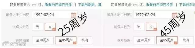 年龄25周岁,保到85周岁,保障时长为60年;年龄45周岁,保到85周岁,保障时长为40年;从数值可以得出,投保年龄越小,保障时长越长。